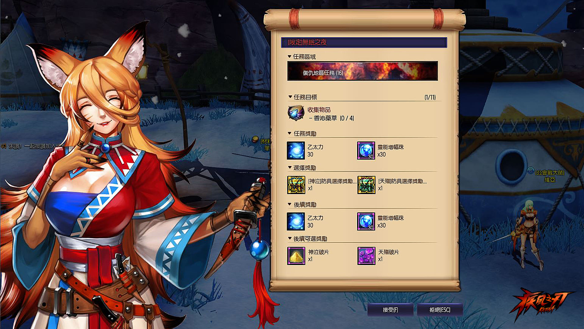 玩家可以在「破滅」與「混沌」副本中擊敗Boss獲得「香泌藥草」,集滿4個任務道具,就能找NPC「狐媚娘」完成任務,獲得「神泣」或「天殤」系列防具選擇箱,「無眠之夜」每日可以完成一次。