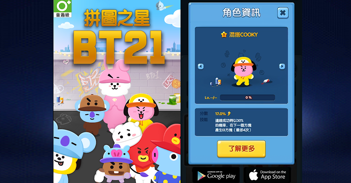 Line Friends旗下的全球人氣卡通形象品牌「BT21」首度創作的手機遊戲《拼圖之星 BT21》,在全球擁有4百多萬名玩家,遊戲關卡多達上千個,仍會不斷新增關卡,不停讓玩家們有全新任務可以挑戰,並定期發出特殊造型的UNIVERSTAR與玩家互動,以可愛療癒的消消樂遊戲方式來擊中大家的心。