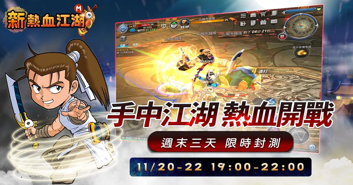 樂意傳播今(20)宣布,旗下代理全新的 MMORPG《新熱血江湖 M》短時間內已經吸引超過 20 萬名玩家參加事前登錄活動,為了回應眾多玩家的期待,因此特別提前於本週末 11 月 20 日 起,連續三天晚間 19:00 至 22:00 展開刪檔封閉測試活動。