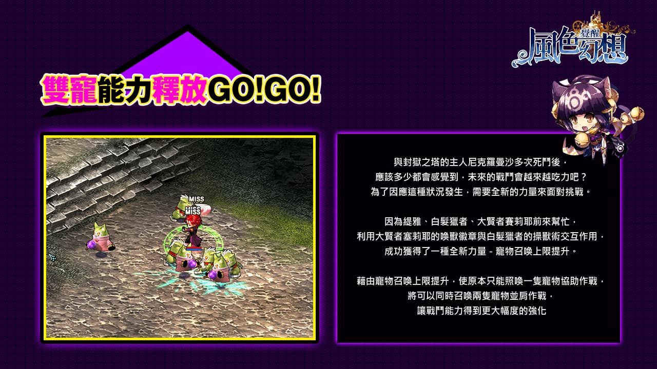 隨著等級越高,挑戰難度也跟著提升,打怪、打王略顯吃力?此次改版也特別推出兩大招,讓玩家們如虎添翼!第一招:只要角色等級超過100等,經過特殊訓練後即可習得「雙重寵物功能」,可提升戰鬥中的召喚寵物上限,召喚出兩隻寵物一齊戰鬥,釋放Double力量!第二招:玩家完成指定訓練後,可獲得基礎戰術書。並透過組隊戰術的方式,還可增強基本素質分別為基礎、進階、英雄。從此開始戰鬥不再受限,感受更強大的自己吧!