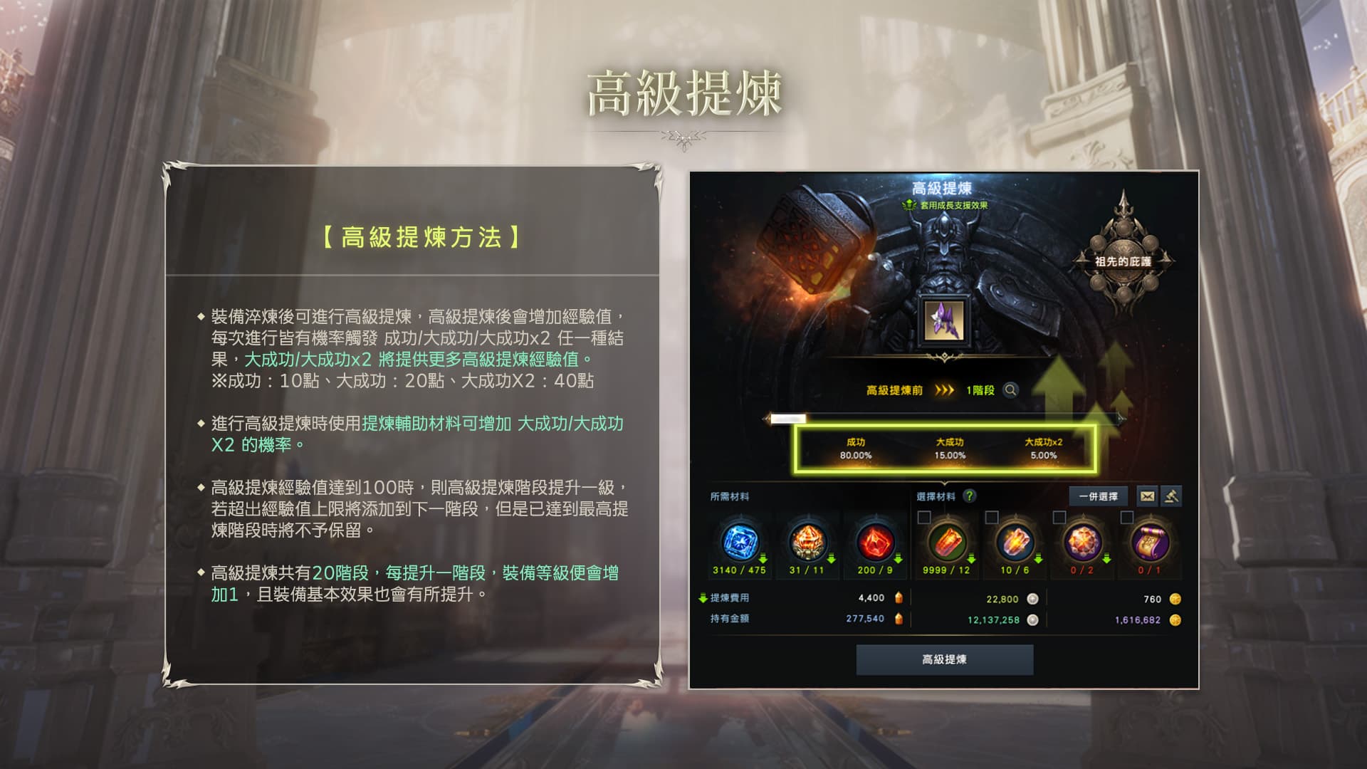 全新推出的「高級提煉系統」讓裝備強化再突破,冒險家可進一步提升裝備能力值,挑戰巔峰實力。