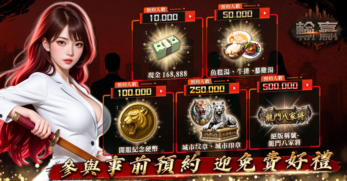 《輸贏》於今日同步舉辦「事前預約」及「勢力撂人來撐場」等活動。凡參與上述活動的玩家,即可在遊戲上市後,獲得包含「現金(遊戲幣) 168,888」、「開服紀念硬幣」、「絕版稱號 - 龍門八家將」、「城市纹章」、「城市印章」⋯⋯等練功道具與限定獎勵,此外,還有機會取得必出高級時裝的「英雄服裝確定券」與頂級稀有度道具的「【會長級】秘密金庫」、「【理事級】戰備物資」和「【組員級】入會禮包」等豐富好禮。